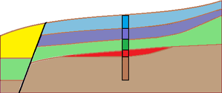 Lors de la saisie des information du sondage, une première fenêtre de dialogue vide est affichée. Après la saisie des coordonnées [3; 0], le profil géologique est chargé à partir du modèle. Maintenant, nous modifions les propriétés de la couche noire supérieure (faille) et entrons une épaisseur de [0 m].