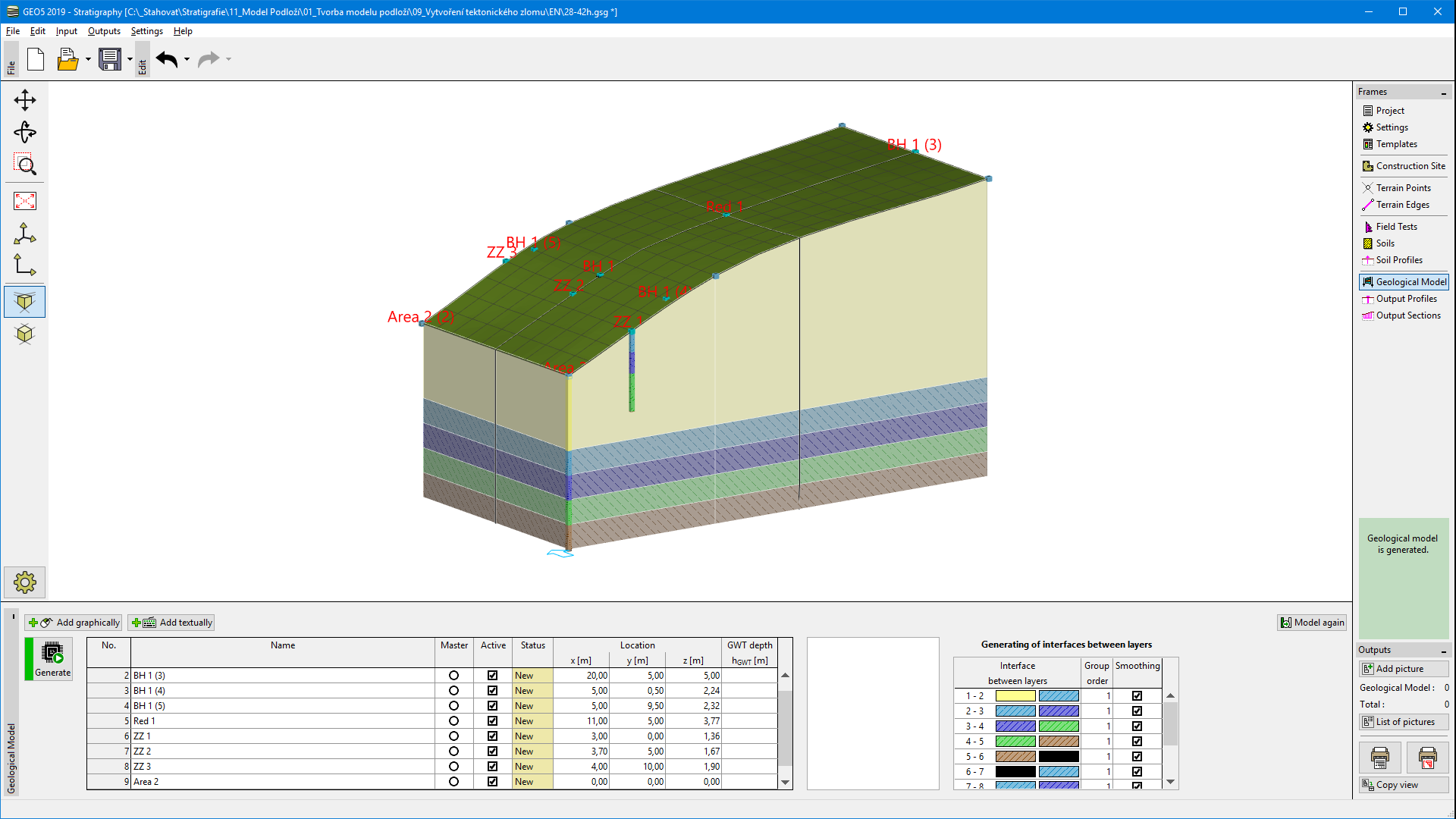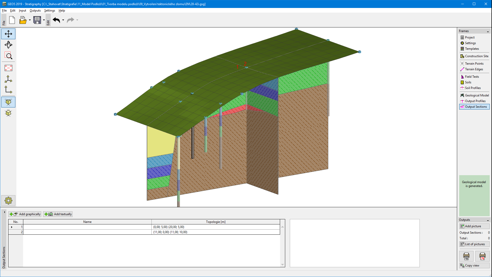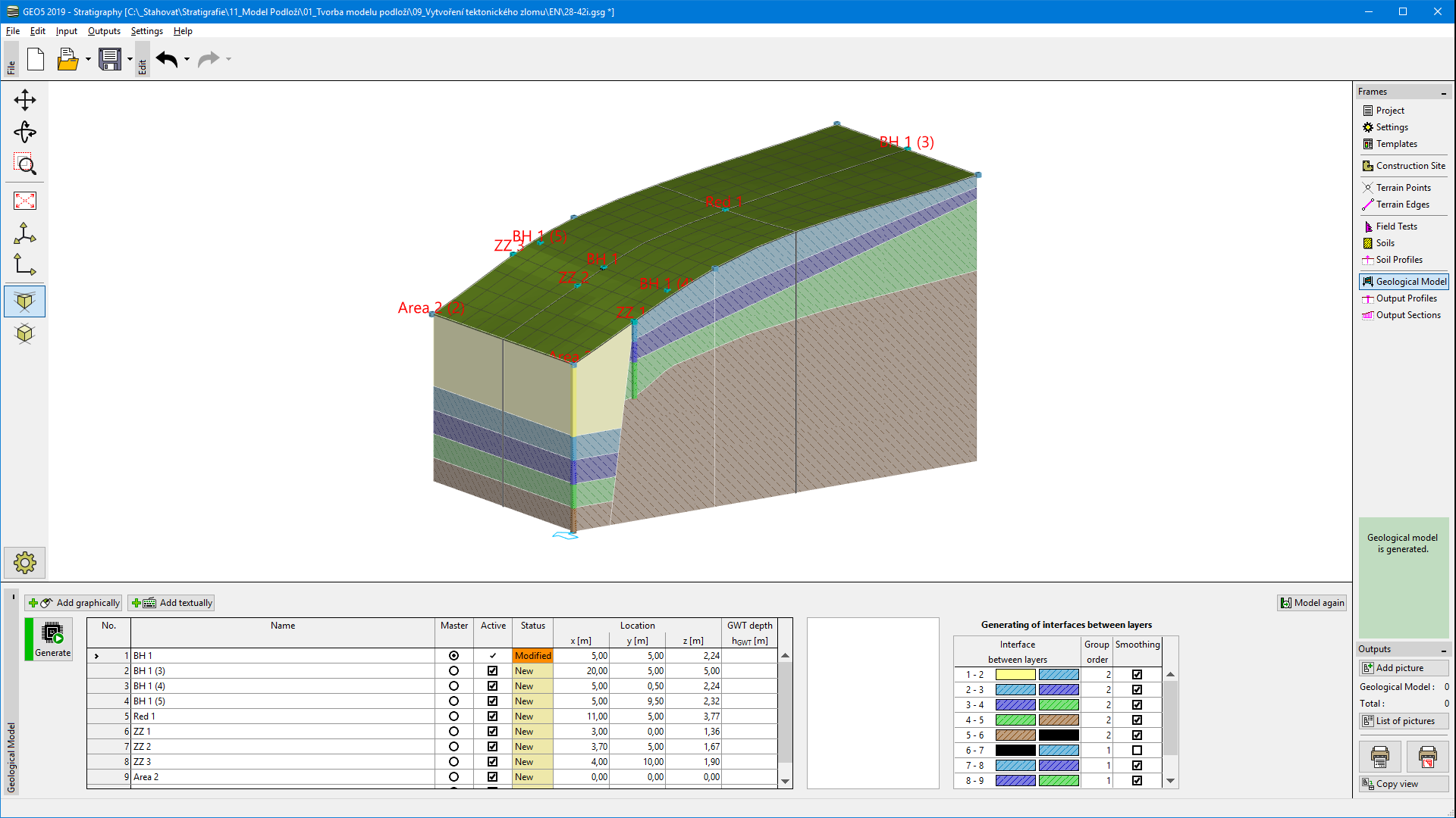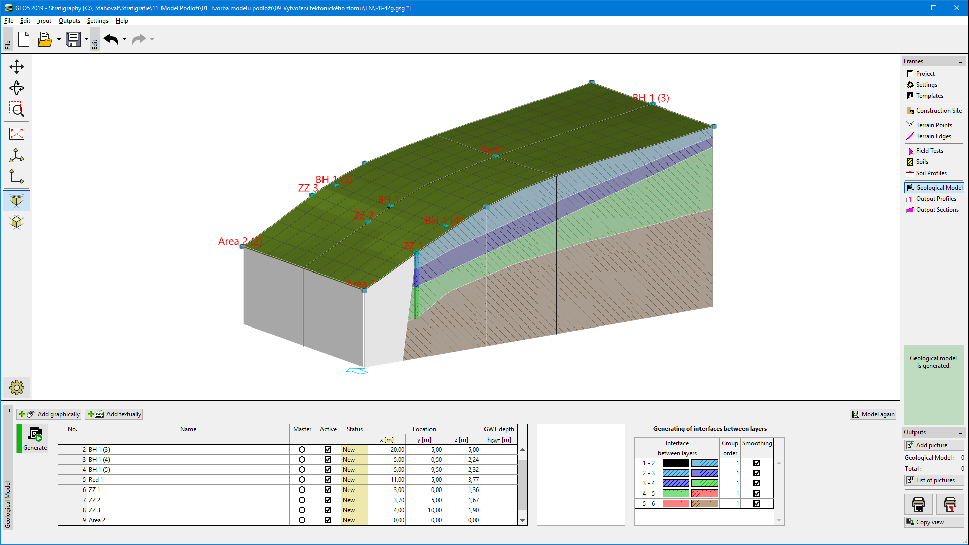 Le modèle est maintenant prêt pour la création de la zone à l'avant de la faille. Nous régénérons le modèle et saisissons deux nouveaux sondages : Area 2 (coordonnées : [0; 0]) et Area 2(2) (coordonnées : [0; 10]).