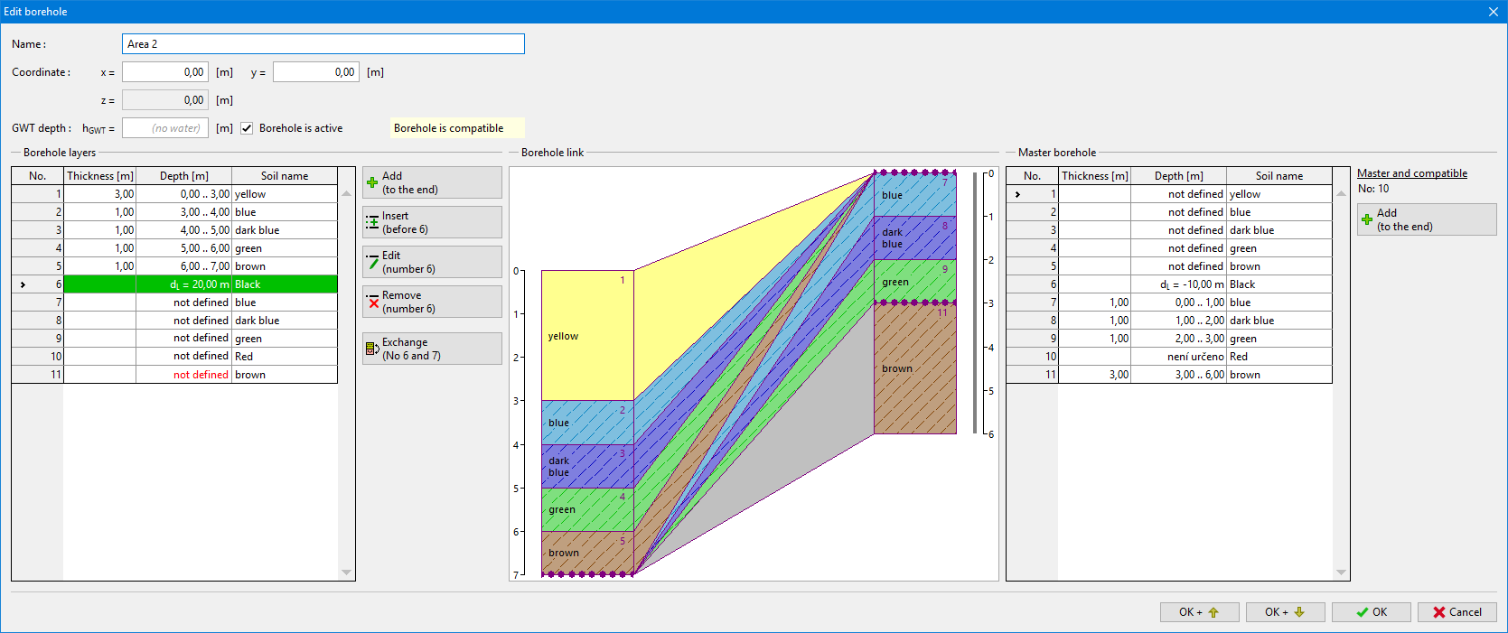 Maintenant, il faut définir les couches de sol dans la zone à l'avant de la faille. Nous choisissons un des sondages (Area 2 ou Area 2(2)) et nous ajoutons les couches au dessus de la faille (en cliquant sur le bouton "Insérer"). Nous définissons les épaisseurs des couches de ce sondage : 3 m - yellow, 1 m - blue, 1 m - dark blue, 1 m - green, 1 m - brown. Ensuite, il faut ajouter les nouvelles couches au sondage maître en cliquant sur le bouton "Compléter des couches supérieures (dans le sondage maître)". Le sondage modifié Area 2 prend la forme suivante :