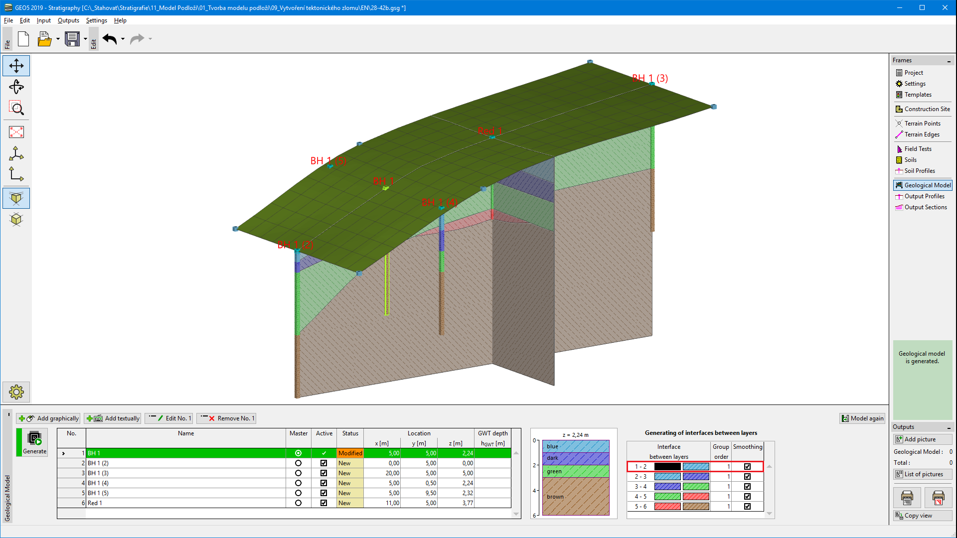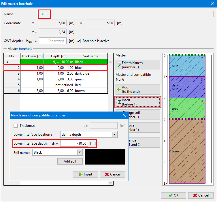 Tout d'abord, nous définissons une interface de faille avec le sondage maître en cliquant le bouton "Insérer (avant 1)". Nous saisissons une profondeur d'interface inférieure égale à [-10 m] - elle est située très au-dessus du terrain. La faille est constituée du nouveau sol "Black".