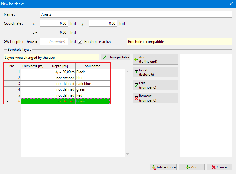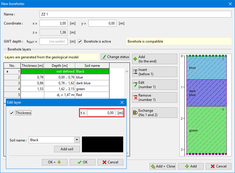 Lors de la saisie des information du sondage, une première fenêtre de dialogue vide est affichée. Après la saisie des coordonnées [3; 0], le profil géologique est chargé à partir du modèle. Maintenant, nous modifions les propriétés de la couche noire supérieure (faille) et entrons une épaisseur de [0 m].