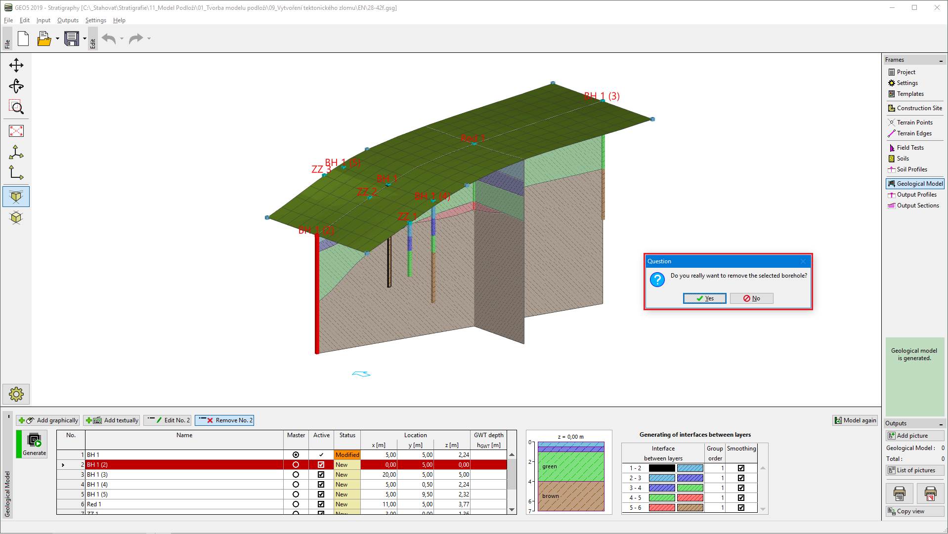 Après avoir entré la faille sur le terrain, nous retirons les sondages situés à l'avant de la faille - dans ce cas, le sondage BH 1(2).